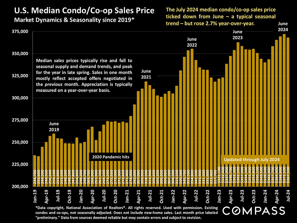 The median condo/co-op sales price in July, $367,500, also dropped slightly from its peak in June. Condos and co-ops are most common in urban markets.
