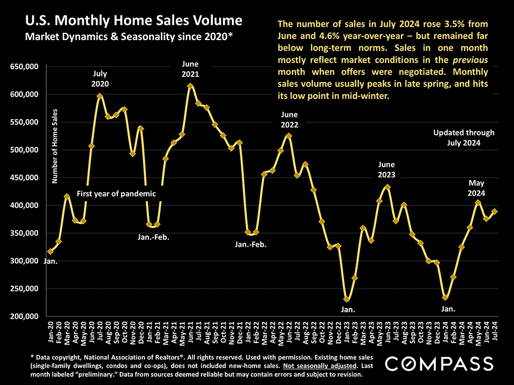 The U.S. median house sales price in July, $428,500, declined slightly from the previous month’s peak: Median sales prices often peak for the year in June.