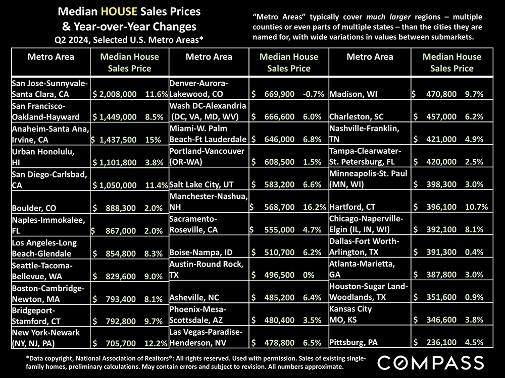 Q2 median house sales prices and year-over-year appreciation rates for selected metro areas: 89% of U.S. metros saw y-o-y price gains. Boosted by its “AI boom,” the San Jose metro became the first to see a quarterly median price of over $2 million.