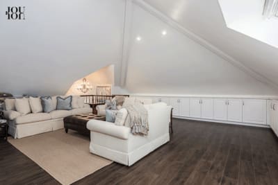 A fabulous bonus room, an exciting and desirable flex-use space, features custom soft-close cabinetry, a quartz counter, and dual workstations that wrap around two sides.