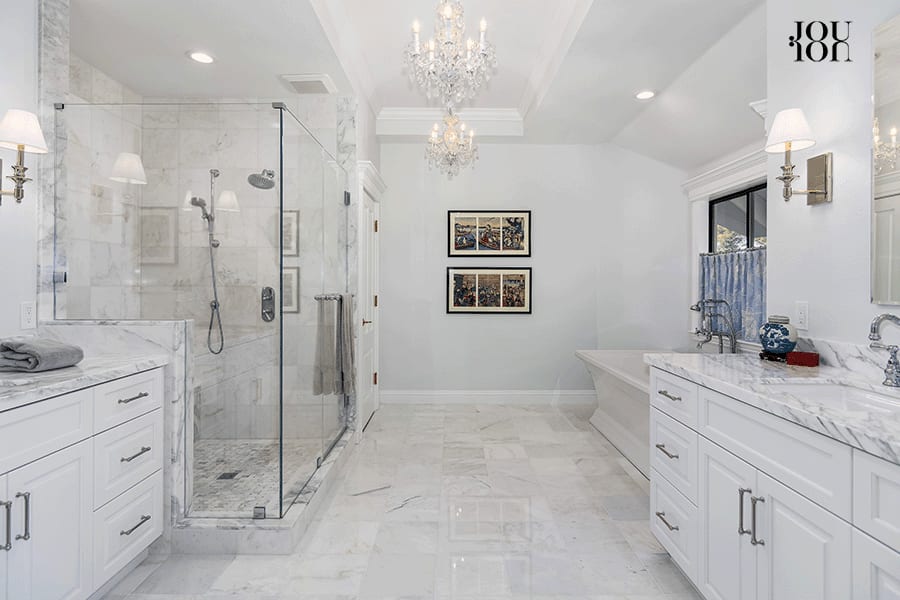 Pamper yourself in the luxurious en suite that includes a marble tile floor, a coffered ceiling, two classic chandeliers, two marble-top vanities, Kohler™ sinks, a large freestanding soaking tub, a glass-enclosed shower with dual shower heads and bench, and polished chrome fixtures.