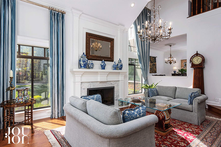 Step down into the formal living room, a striking room with a crystal chandelier suspended from the vaulted ceiling and a fireplace with a carved mantel redesigned with a Carrera™ marble surround.