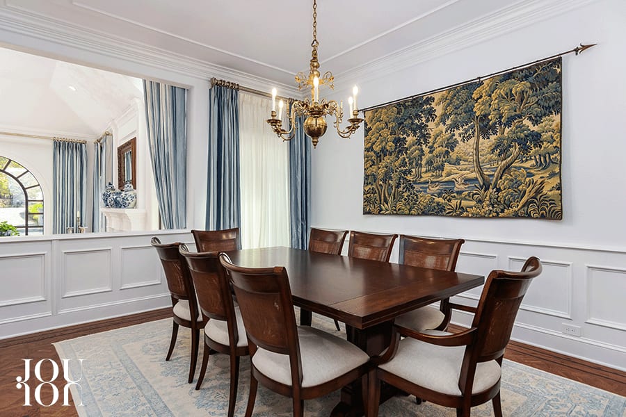 The adjacent formal dining room is designed with a wainscot and a coffered ceiling with medallion molding.