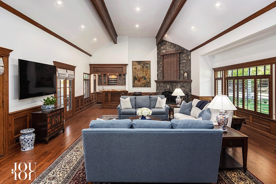 Glass-paneled French doors open to the expansive family room that features a front-facing window with plantation shutters, an exposed beam ceiling, and a wainscot. A gas fireplace with a cobblestone surround touches the ceiling, and two sets of French doors open to the backyard. A walk-around bar with counter seating has a quartz counter, a hammered stainless sink, a wine refrigerator, and cabinetry.