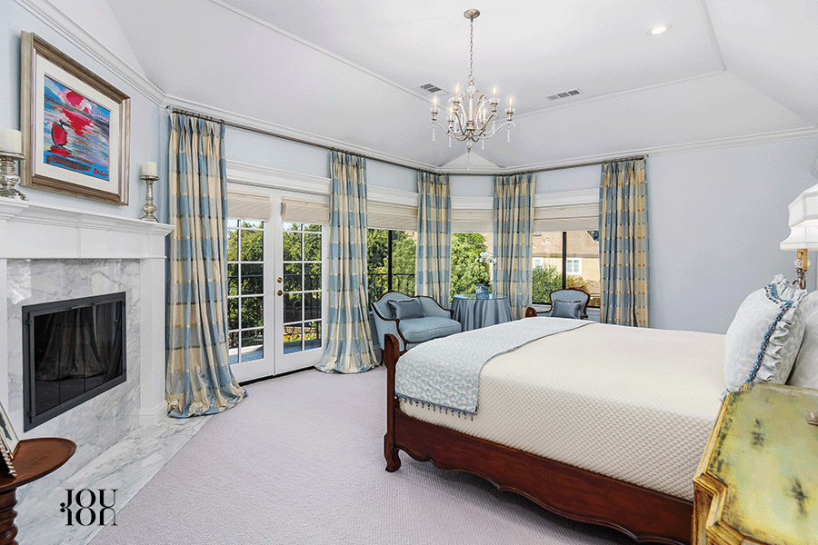 The primary suite features a high ceiling, a gas fireplace sporting a new marble surround and hearth, and room to create a cozy sitting area. French doors open to a private view balcony. Two large walk-in closet rooms feature custom built-in shelving and dresser drawers.