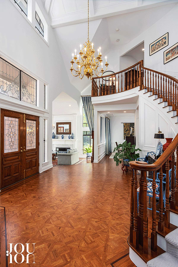 Step through the dramatic glass-paneled double front door with a matching transom and side panels into a two-story foyer with a parquet floor and feast your eyes on the unmatched attention to detail. Parquet floors in the entry seamlessly flow into the hardwood floors.