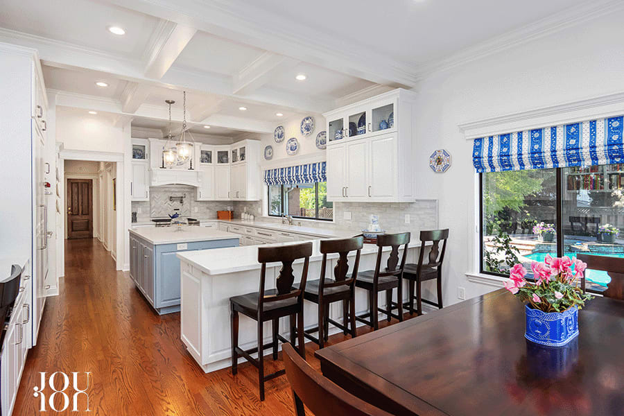 The new gourmet kitchen’s impressive scale of design incorporates a functional workspace with a classic aesthetic and includes a coffered ceiling, quartz counters with a marble subway tile backsplash, dual-toned custom soft-close cabinetry with pullouts and brushed nickel pulls, a huge island illuminated by a pair of glass pendants, a peninsula island/breakfast bar, casual dining area, a walk-in pantry, and an Allia™ ceramic single-bowl sink. A paneled full-size Thermador™ refrigerator and full-size freezer complement the new dual Wolf™ ovens, a six-burner cooktop with a pot filler, and a Bosch™ microwave and a Cove™ dishwasher.
