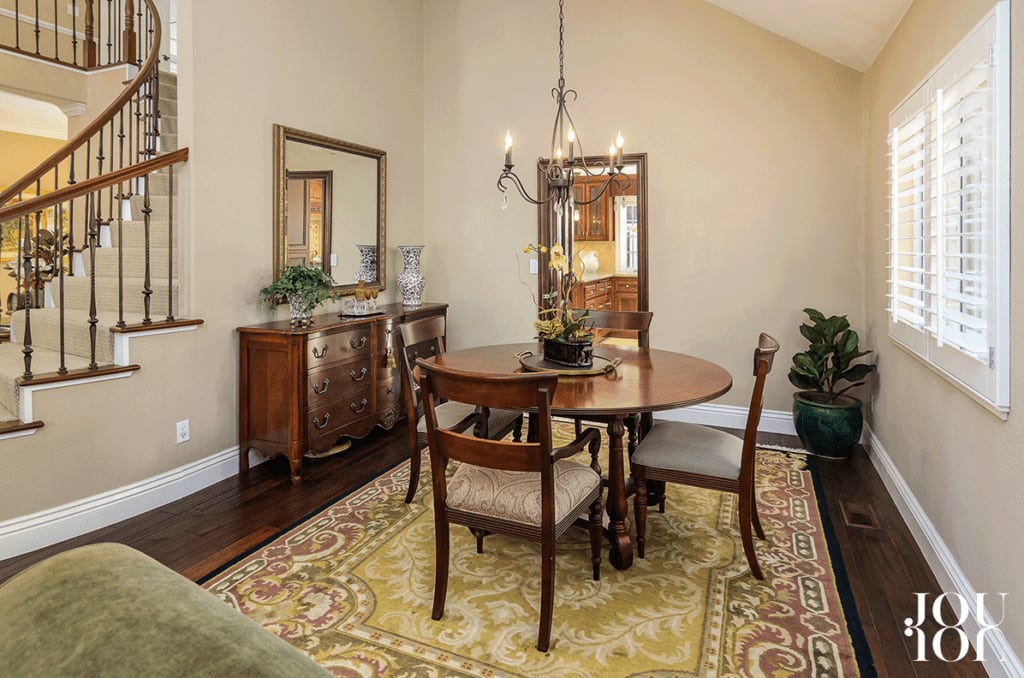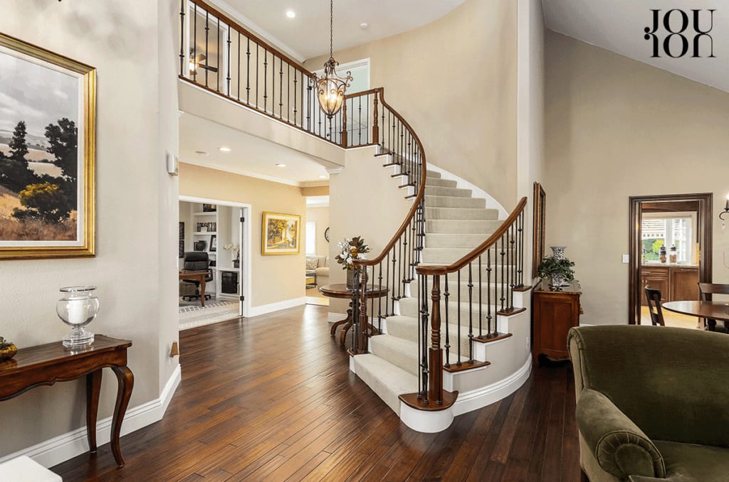 The foyer accentuates an open floor plan and is graced with Catalina scratch-resistant hardwood floors, showcasing a grand staircase with a wrought iron and wood balustrade.