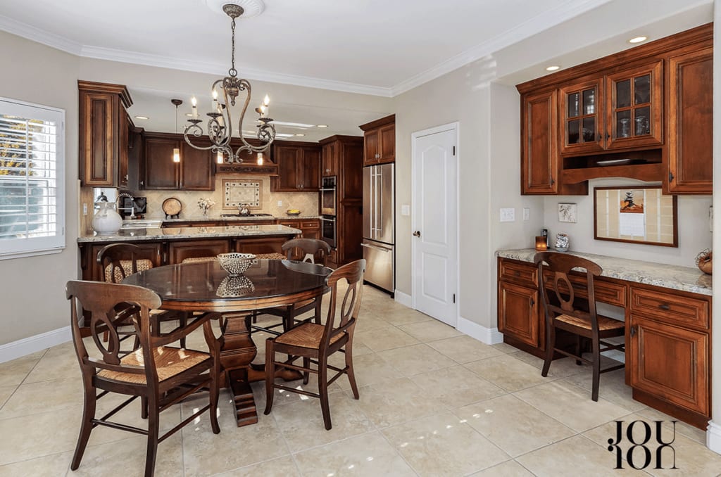 The porcelain tile floor flows from the kitchen into the casual dining area. The built-in workstation boasts a granite counter and custom cabinetry.