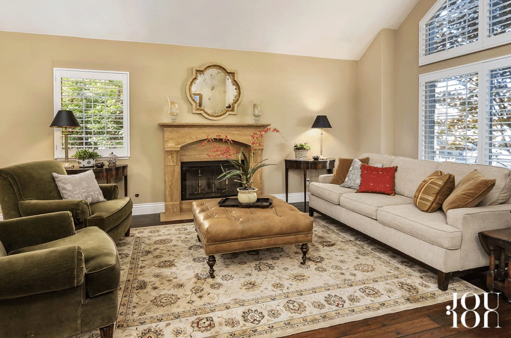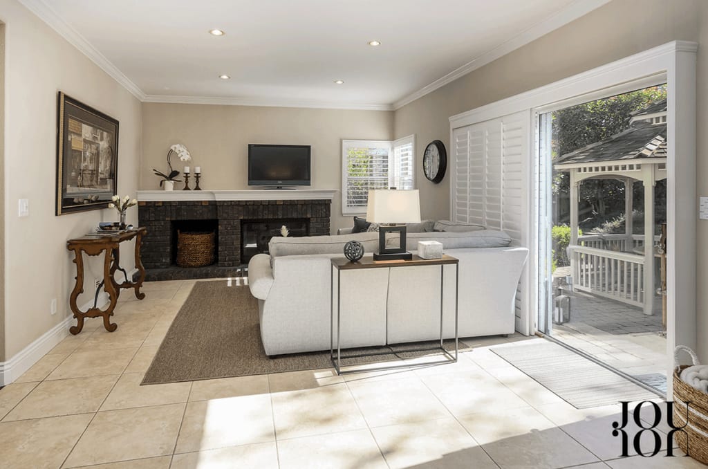 A vaulted ceiling adds volume to the already sizeable formal living, which is anchored by a woodburning fireplace with a gas starter and a travertine slab surround.