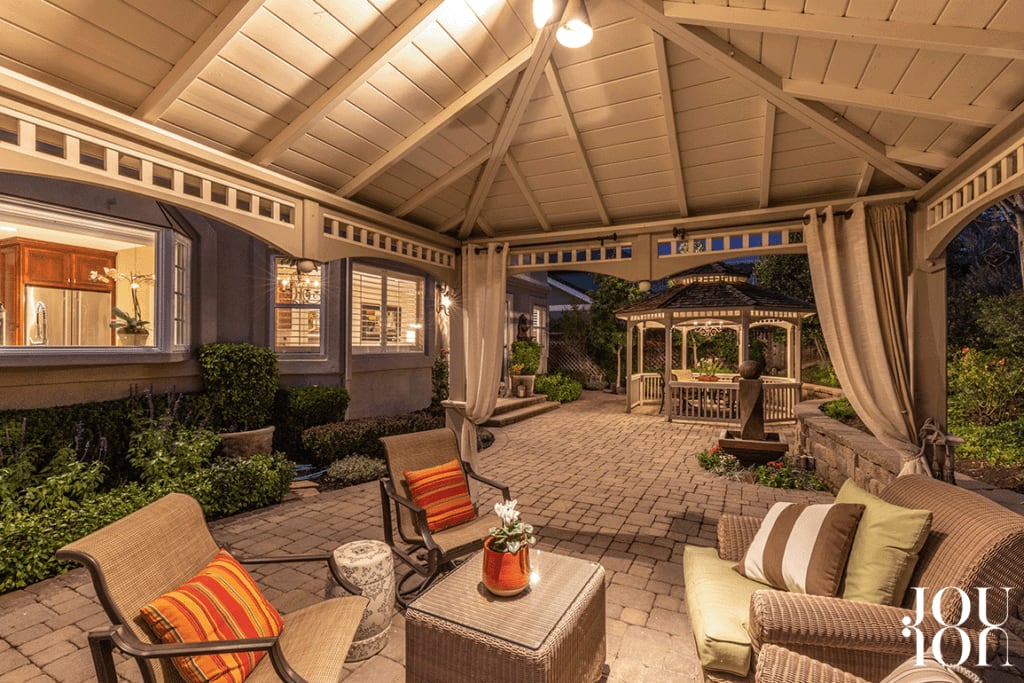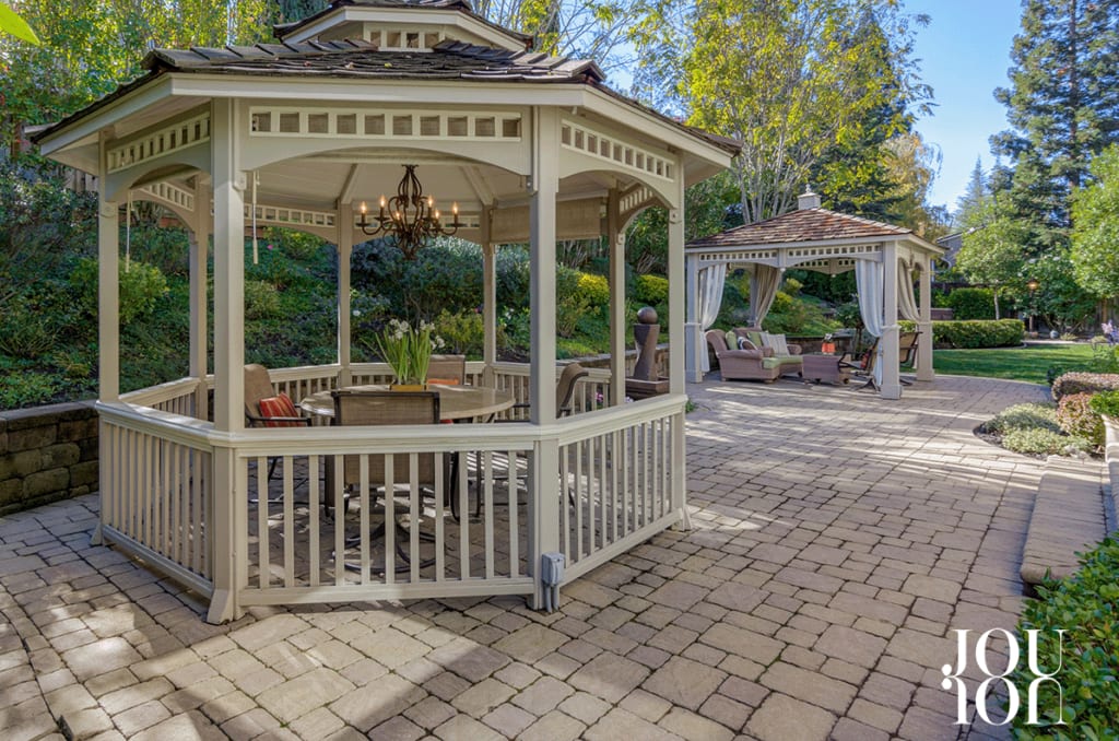 Gather with family and friends on the paver patio, under two gazebos featuring wood shake roofs, lighting, and electrical outlets.
