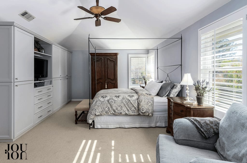 The primary suite at the top of the stairs is behind a double-door entry and features a vaulted ceiling, a wall of custom-built cabinetry with soft-close drawers and doors, a sitting area, and a walk-in closet with Elfa™ closet organizers behind sliding mirrored doors.
