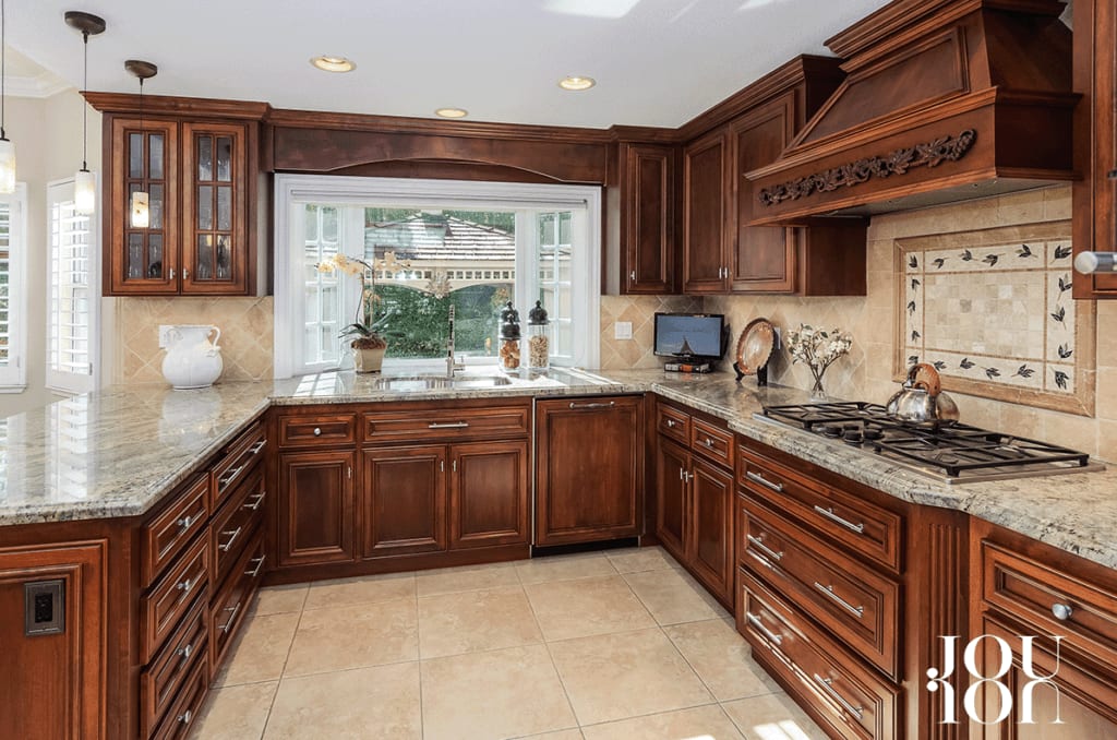 The chef’s kitchen is beautifully appointed with custom Alder wood cabinetry, granite counters with an ogee edge, upper glass-paneled cabinetry, a travertine tile backsplash, a decorative mosaic behind the range, under counter lights, recessed ceiling lights, and a peninsula island/breakfast bar illuminated by a trio of Onyx™ pendant lights. Stainless appliances include GE Monogram™ dual convection electric ovens, a 36-inch, five-burner Dacor™ gas cooktop, a Jenn Air™ French door refrigerator, and a GE Profile™ dishwasher with cabinet facade.