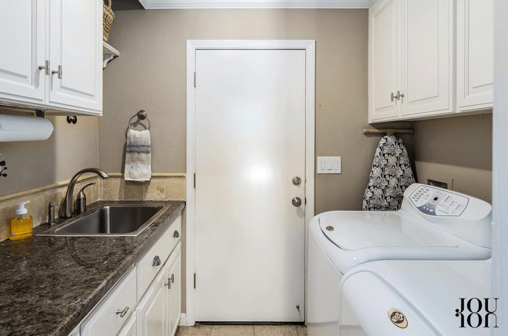 The laundry room features an electric Maytag washer and gas dryer, a stainless utility sink, new cabinetry with a granite counter, and a marble tile floor.