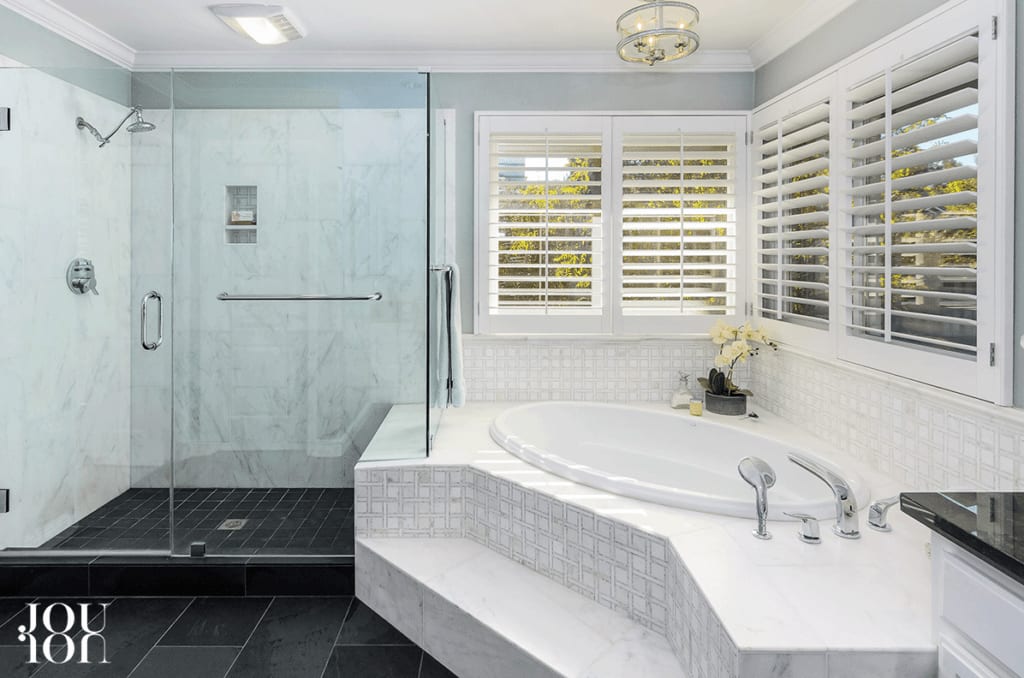 The en suite is updated with dual white vanities, black granite counters, black slate floor tile, honed marble, mosaic tile bathtub and shower surround, and Hansgrohe™ chrome faucets.
