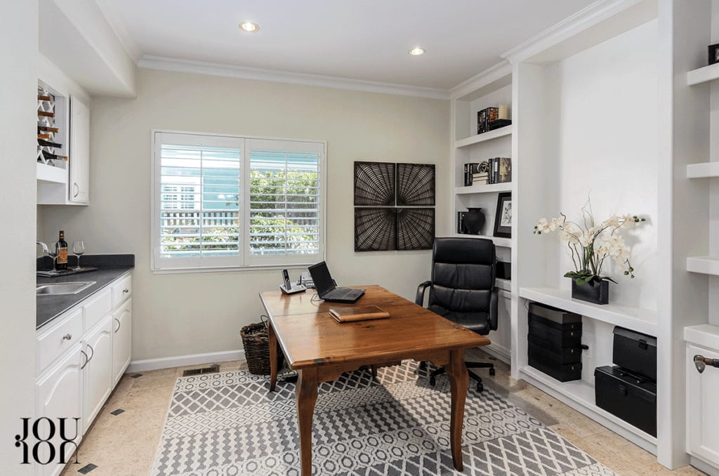 The office, also an ideal main-level bedroom, features custom built-in cabinetry, a wet bar, recessed lighting, and a marble-tile floor.