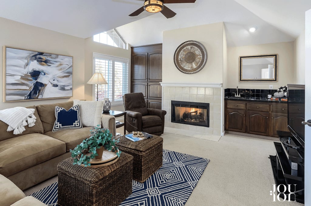 The large adjacent family room boasts a wood-burning fireplace and a seamless flow to the backyard.