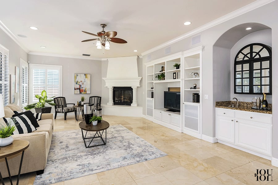 A wall of built-in cabinetry and a wet bar anchors the adjacent family room, featuring a gas fireplace with a raised hearth.