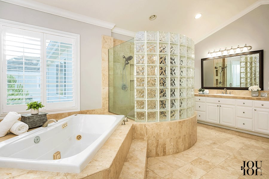 The en suite has a vaulted ceiling, a travertine tile floor, two separate vanities, an oversized shower with multiple shower heads, dual water closets, and a step-up jetted tub.