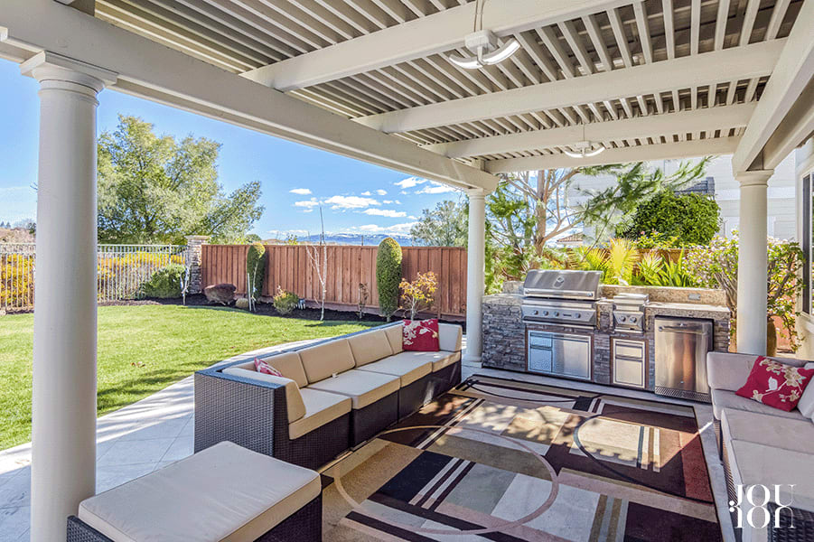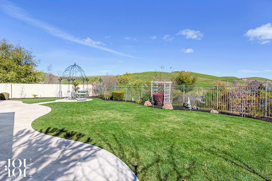 The level backyard borders the golf course and offers unobstructed views of the surrounding hills.