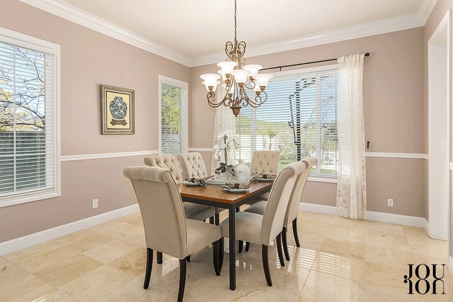 Decorative millwork defines the adjacent formal dining room with chair rail molding and a backyard view.