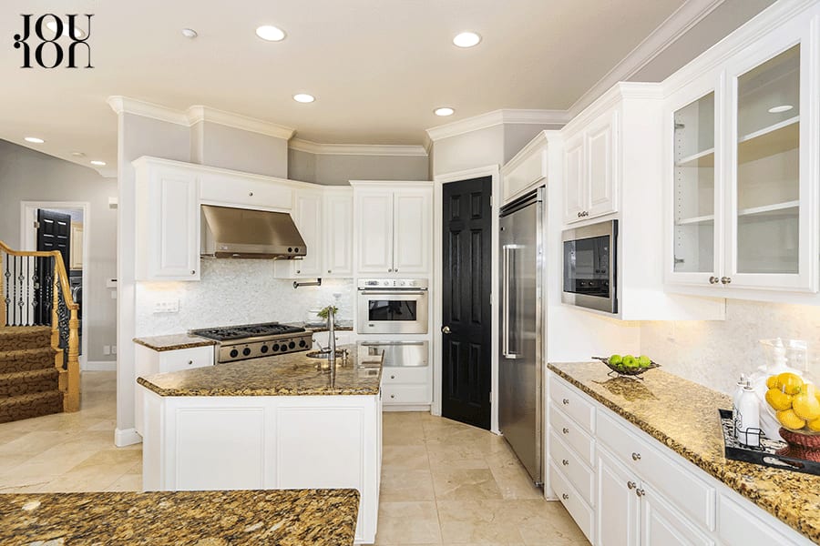 Granite counters with the soft, iridescent sparkle of a Mother-of-Pearl tile backsplash wrap around the kitchen and painted cabinetry. A central island provides additional prep space and a sink. Stainless GE Monogram™ appliances include a gas range, oven, warming drawer and microwave, and a Viking™ refrigerator.