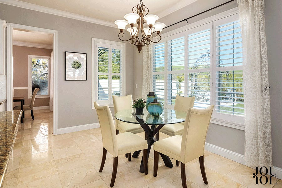 The spacious casual dining area has a backyard view window with plantation shutters.