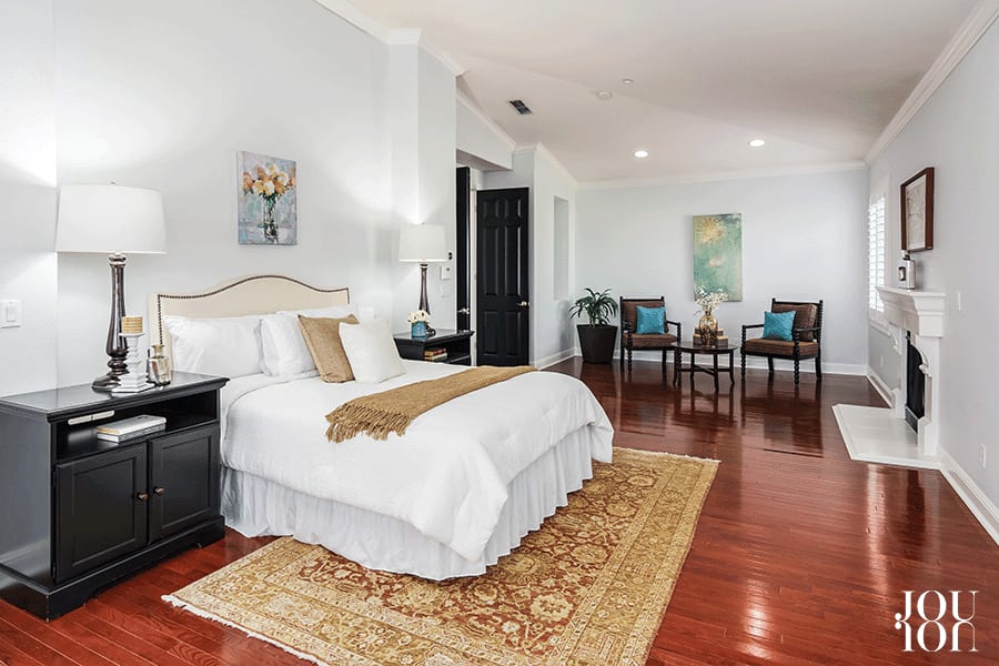 The primary suite is located behind a double-door entry. Create a cozy sitting area in front of the gas fireplace in this sizable space with hardwood floors, plantation shutters, and crown molding.