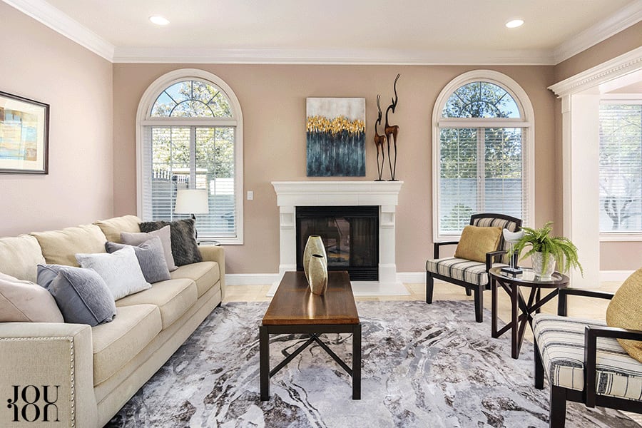 Marble floors continue into the formal living room, featuring a front-facing view window and a gas fireplace with a carved mantel.
