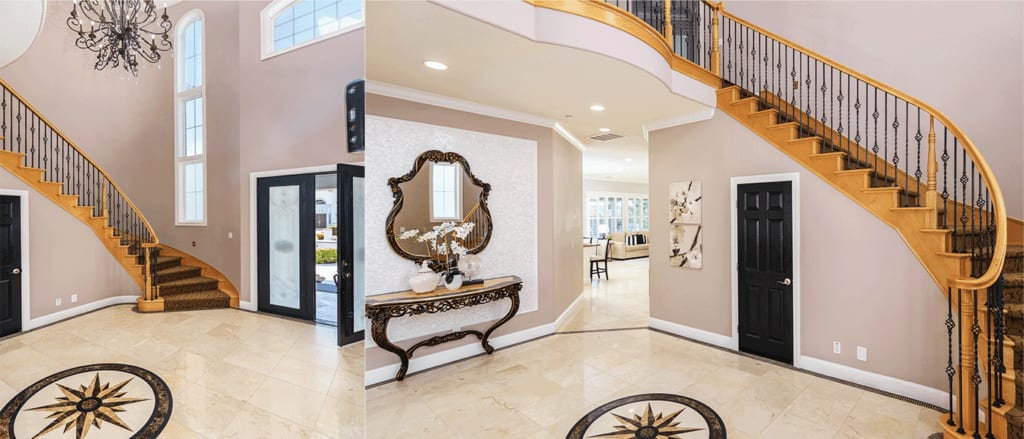 Grand two-story foyer upgraded with Marfil™ marble floors, a decorative medallion inlay, a sweeping front staircase, and a striking Mother-of-Pearl tile accent wall.