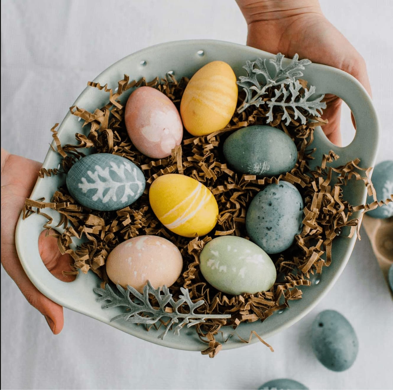 By following the steps below, you’ll be able to turn vegetables, fruits, and spices into kid-approved, eco-friendly dyes (no food coloring here!). The actual dyeing process is identical to what you’ve done in the past — boil your eggs, let them chill, and dip in the homemade dye. The only difference: You can tailor the dye to your desired result by adjusting the time and adding materials (think: extra onion skins for a bolder orange hue). Want a subtle wash of color? Let your eggs soak for 30 minutes tops. Looking to make a vibrant statement? Leave ’em in the dye overnight.