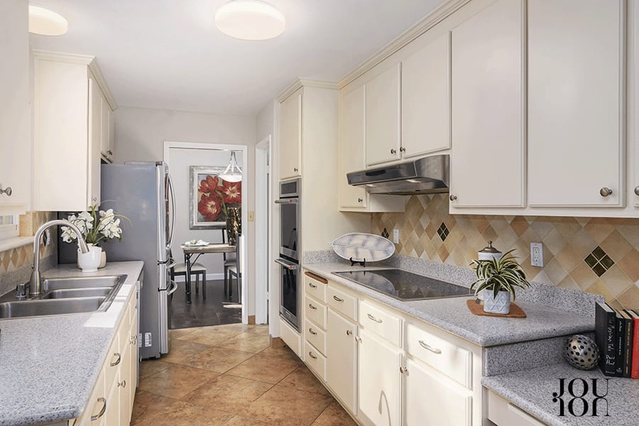 The galley-style kitchen features a tumbled stone tile backsplash over a Corian™ counter, dual KitchenAid™ ovens and dishwasher, an electric cooktop, and a Samsung™ refrigerator.