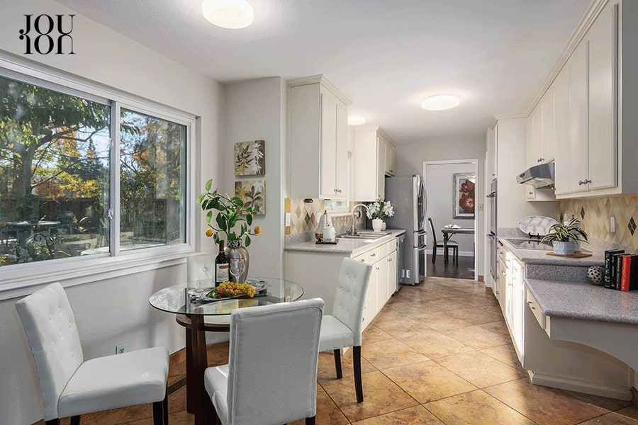 The kitchen is adjacent to a casual dining area.