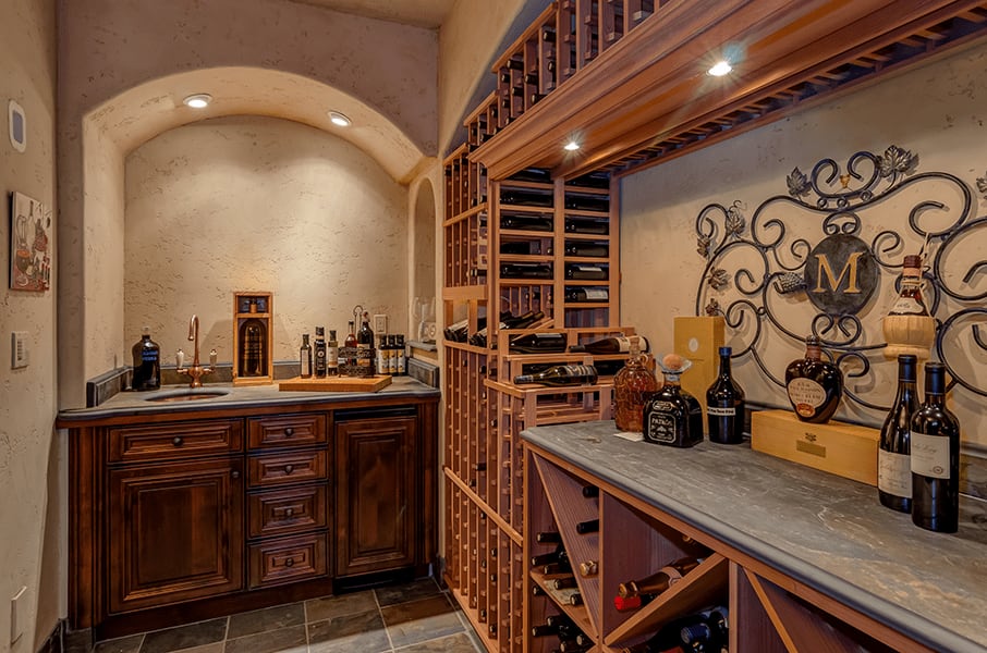 A temperature-controlled wine cellar at the bottom of a circular staircase with custom-forged iron railings features double-deep racks and storage for about 4,000 bottles.
