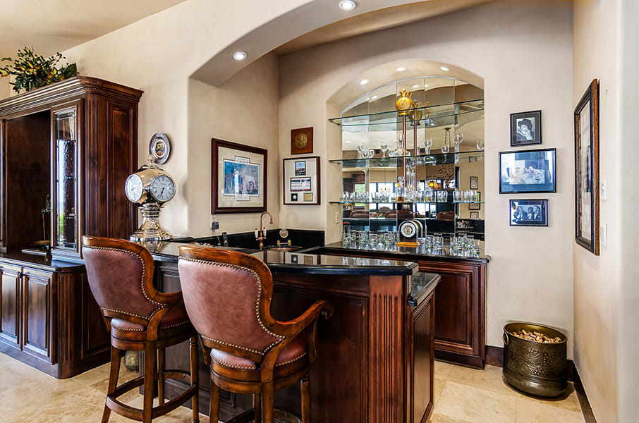 A large wet bar featuring a copper sink, refrigerator, granite counter, and custom cabinetry anchors the game room.
