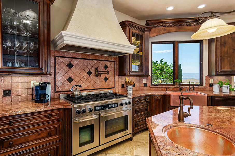 The adjacent gourmet kitchen is beautifully appointed with a stunning copper apron and prep sinks, granite slab counters, custom walnut-stained cabinetry, a walk-in pantry, and a sizeable island.