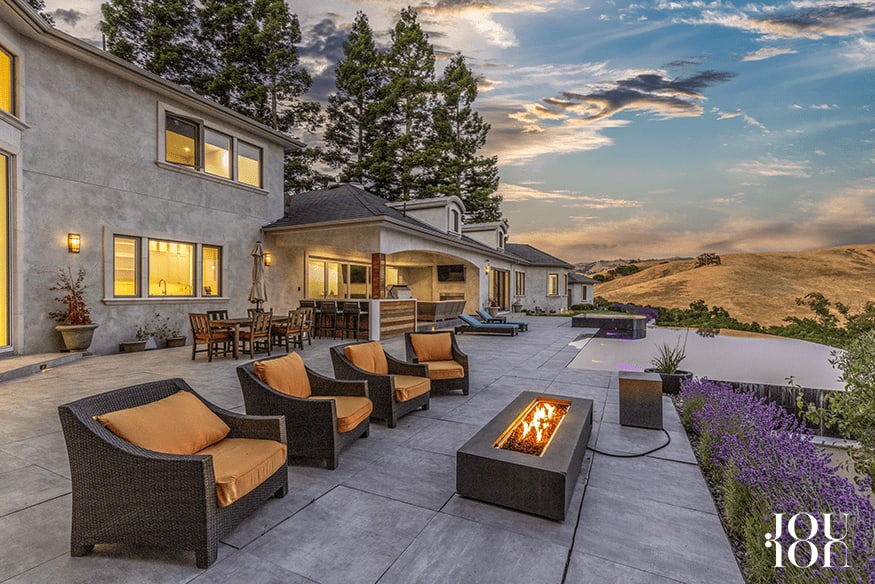 Gas fireplace, an outdoor dining venue, and an outdoor kitchen with picturesque views.