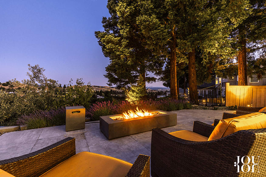 Lush landscape design with lavenders, fruit trees, towering redwoods, and sod.