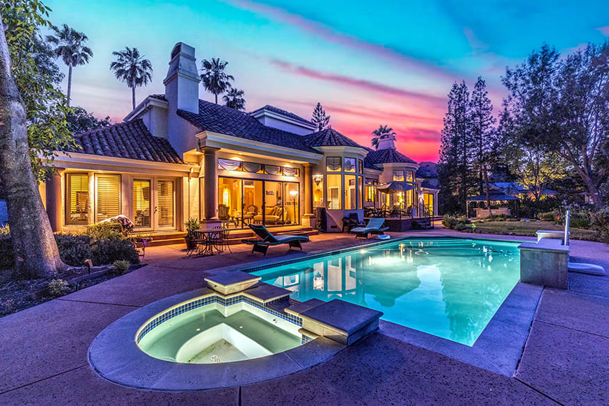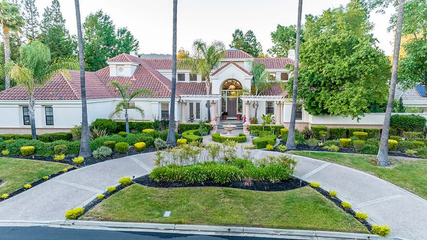 Behind the grand circular driveway and impressive front courtyard entry with a tiered fountain is a light-drenched floor plan that features four bedrooms, three and a half bathrooms, an executive office, formal living and dining rooms, and a fabulous chef’s kitchen that is open to the expansive family room.