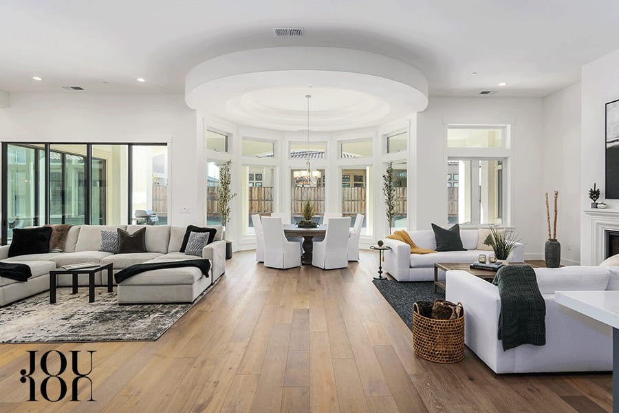 The great room defines an open, light-drenched living space and features a stunning rotunda dining area under a 13-foot coffered ceiling with a view of the backyard.