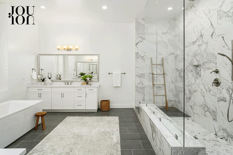 Upgraded tile in the spa-inspired en suite includes 24 by 48 tile in the walk-through shower. There are dual vanities and an oversized freestanding soaking tub.
