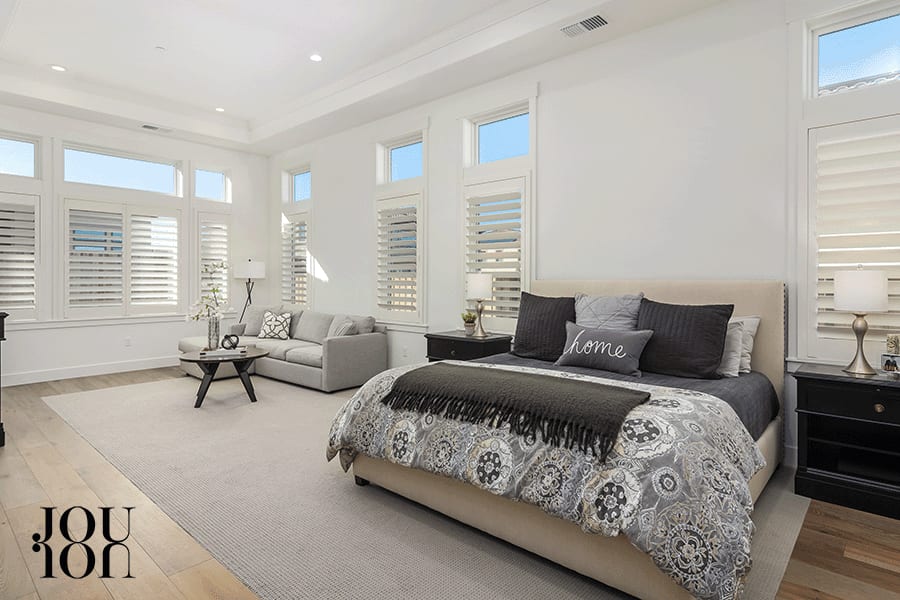 The primary suite is a sumptuous retreat with an upgraded 42-inch gas fireplace flanked by custom built-in cabinetry, a 200-square-foot sitting room with backyard views, high coffered ceilings, and dual walk-in closets.