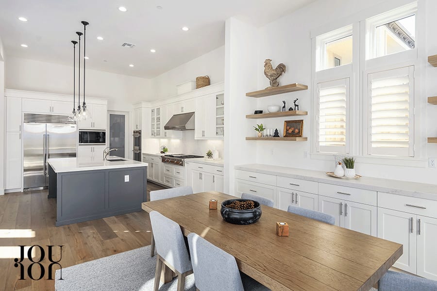A built-in buffet, cabinetry, and floating shelves are featured in the adjacent casual dining nook.