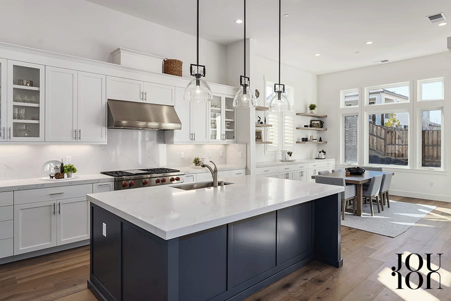 The beautifully appointed gourmet kitchen features upgraded quartz counters, a backsplash, upgraded dual-toned paint colors, Kohler™ stainless sink, built-up soft-close cabinetry, and an enormous island/breakfast bar illuminated by stylish Restoration Hardware™ pendants.