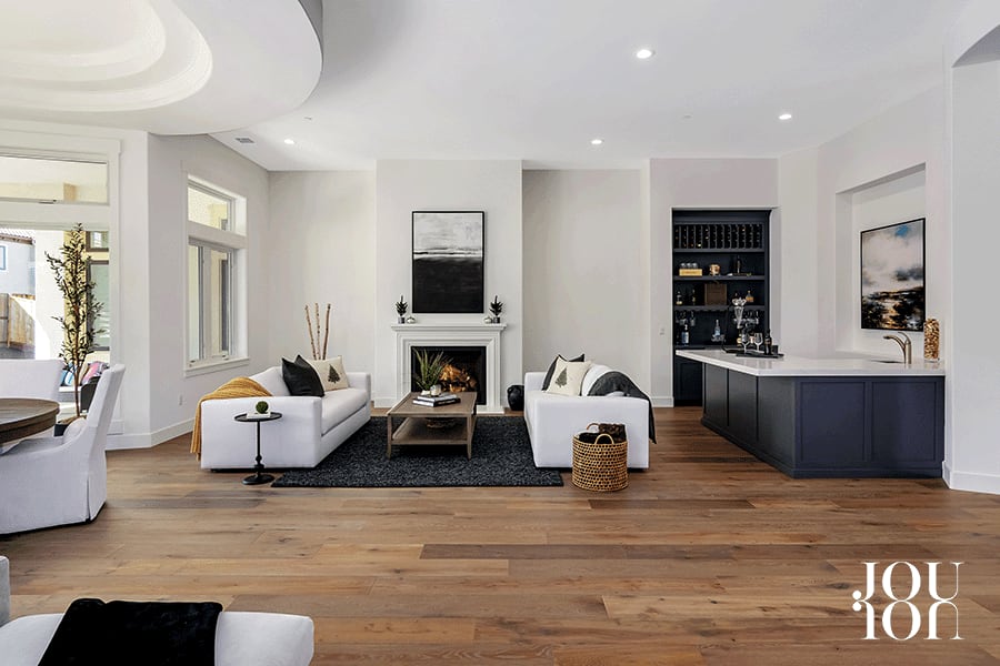The great room is anchored on one side by a gas fireplace and a walk-around wet bar with a wine fridge, quartz counter, custom built-in cabinetry, and a stainless sink.