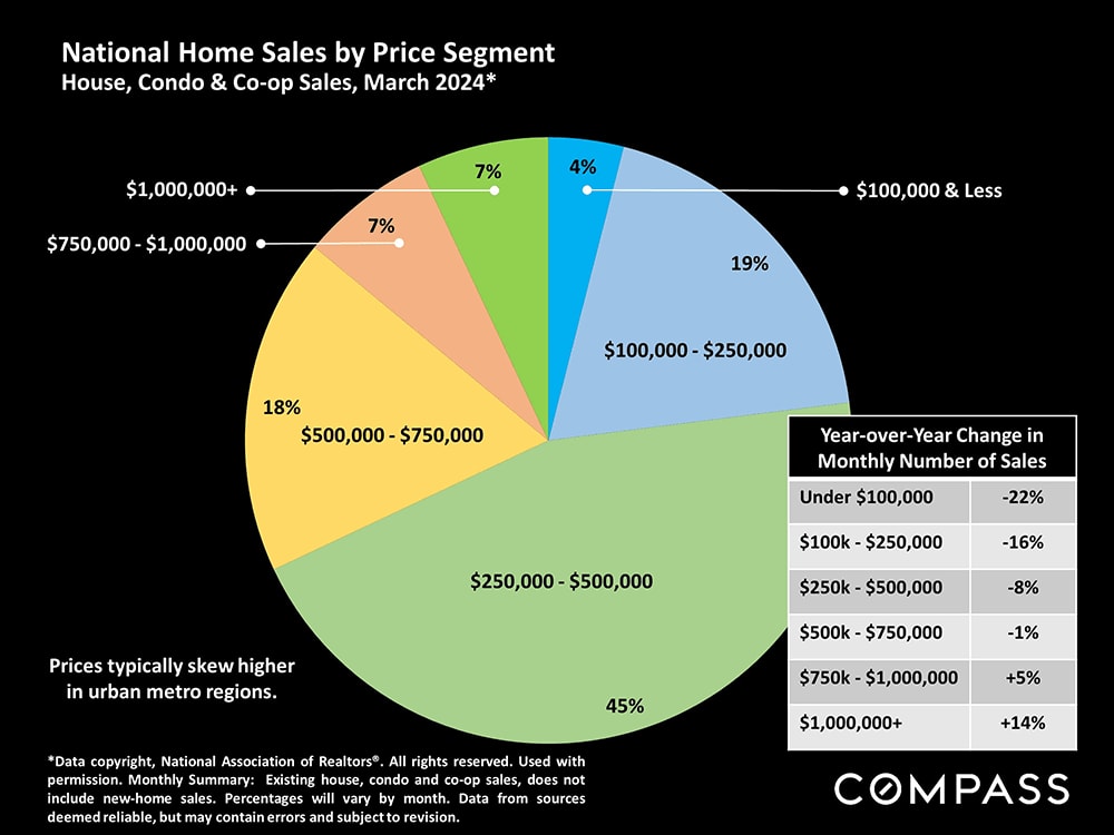 A breakdown of U.S. home sales by price segment: Sales in higher price ranges have been rising, while lower price segments have seen considerable declines. Part of this dynamic is simple home-price appreciation, but affluent buyers also appear to be playing a larger role in the market.