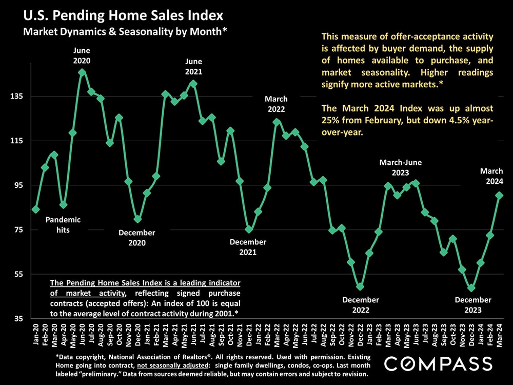 NAR’s Pending Sale Index, March data released this morning: Continuing to climb rapidly in 2024 – up 25% from February – but still slightly down on a year-over-year basis.