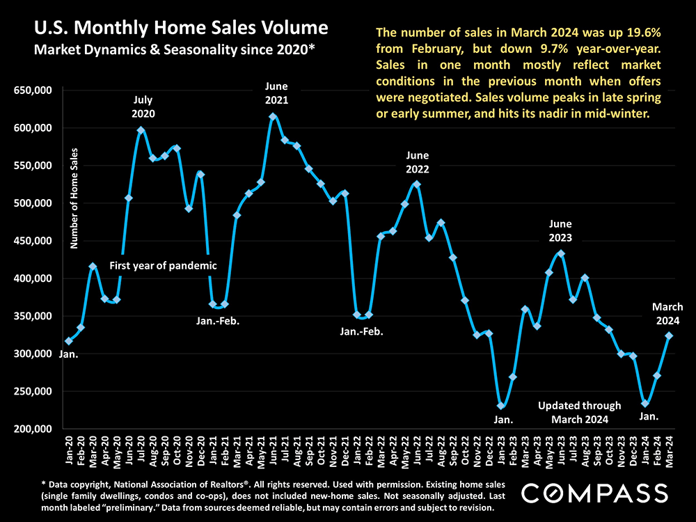 Sales are a lagging indicator, running 3 to 6+ weeks behind new listings coming on the market and listings going into contract. Based on the surge in inventory in March, we expect sales volume to jump substantially in April.