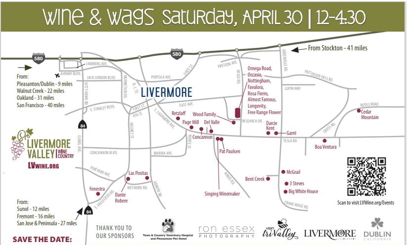 That’s the idea behind Saturday’s Wine and Wags, which runs from 12 p.m. to 4:30 p.m. (April 30, 2022) at more than 25 wineries in the Livermore area. In addition, more than a dozen local animal rescue operations will be involved, some offering dog adoptions.